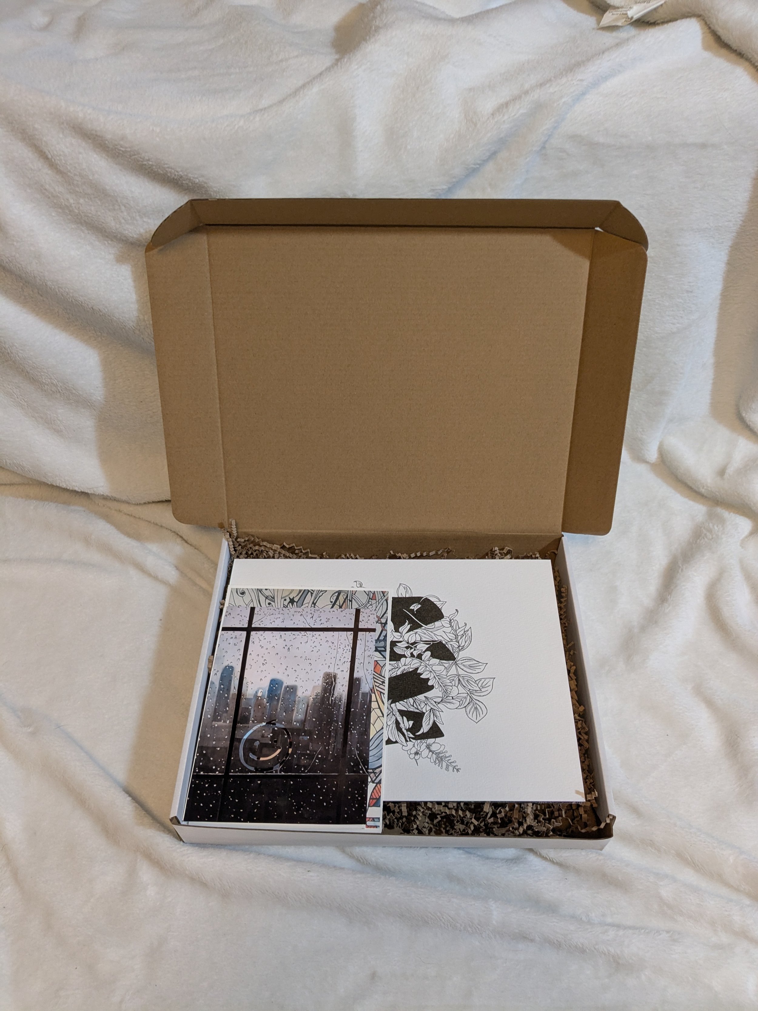 Each box is random and filled with various drawings and painting prints which makes it as fun as it is! Please browse through my website with examples of the many options it can be.